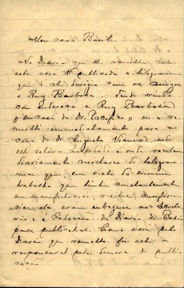 Carta de Antônio Pacífico Pereira, de 02 de maio de 1919, a José Basílio Pereira explicando da demora da publicação de um telegrama à Rui Barbosa no Diário da Bahia. Dá notícias de alguns conhecidos.