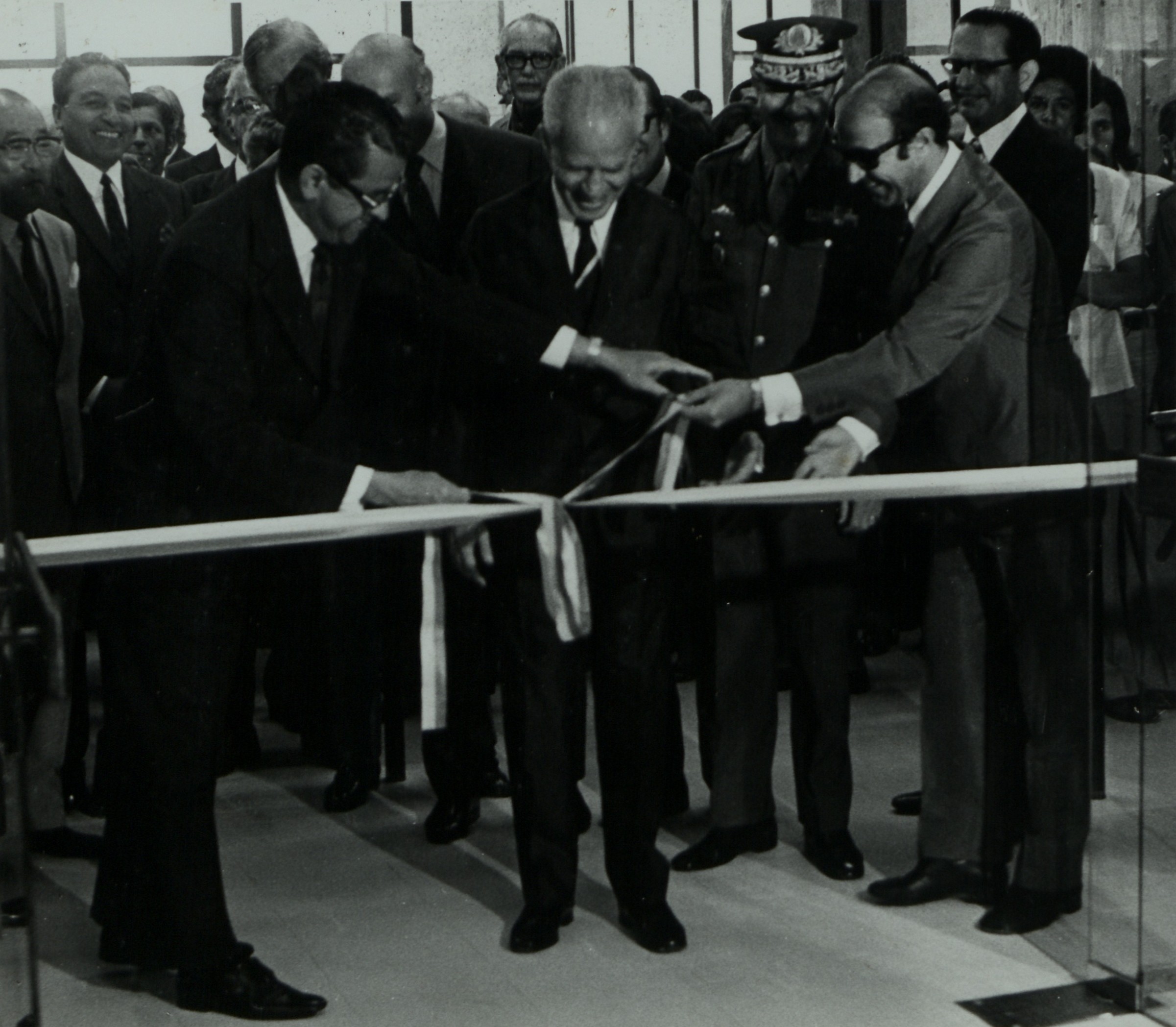 Cerimônia de inauguração das novas instalações da Biblioteca Central. Autoridades na frente da porta da entrada: Em primeiro plano aparecem três homens junto à fita de inauguração desfazendo o laço. Da esquerda para a direita vê-se o Ministro da Educação Jarbas Passarinho, ao centro, o Reitor da Universidade de Brasília Amadeu Cury e ao seu lado o Diretor da Biblioteca Central Elton Eugênio Volpini. 13 de Março de 1973.