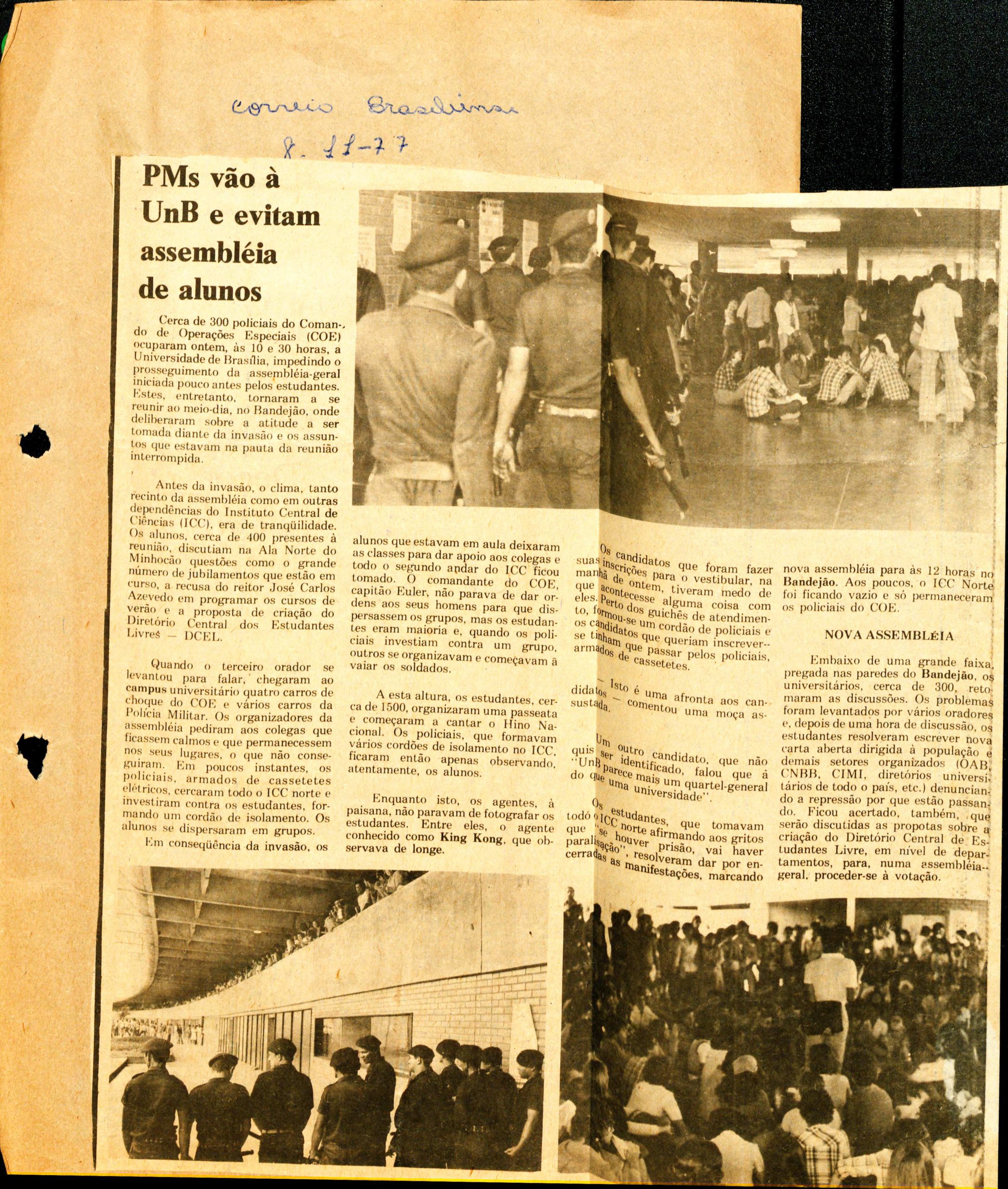 "Cerca de 300 policiais do Comando de Operações Especiais ocuparam ontem, às 10 e 30 horas, a Universidade de Brasília, impedindo o prosseguimento da assembléia-geral iniciada pouco antes pelos estudantes. Estes, entretanto, tornaram a se reunir ao meio-dia, no Bandejão, onde deliberaram sobre a atitude a ser tomada diante da invasão e os assuntos que estavam na pauta da reunião interrompida".