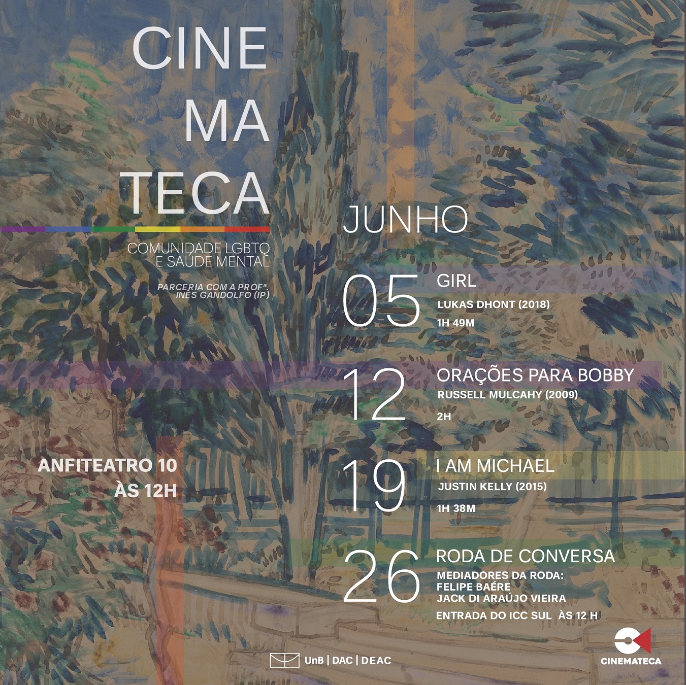 Arte CinematecaPatrícia Arantes8 de janeiro de 2026 Documento Cinemateca Baixar MetadadosTítuloArte CinematecaDescriçãoArte convite para Cinemateca - Comunidade LGBTQ e saúde mental, evento realizado dentre as ações da celebração do Mês do Orgulho LGBTQIA+ na UnB.AutorDiretoria da Diversidade da UnB (DIV)Unidade responsável na UnBDecanato de Assuntos ComunitáriosData(s)junho 2019Tipo de MídiaJPGDireitosDireitos reservados à Diretoria da Diversidade da UnB (DIV).Nome da exposiçãoNome da exposição - UnB 60 anos - protagonismo estudantil - LGBTQIA+