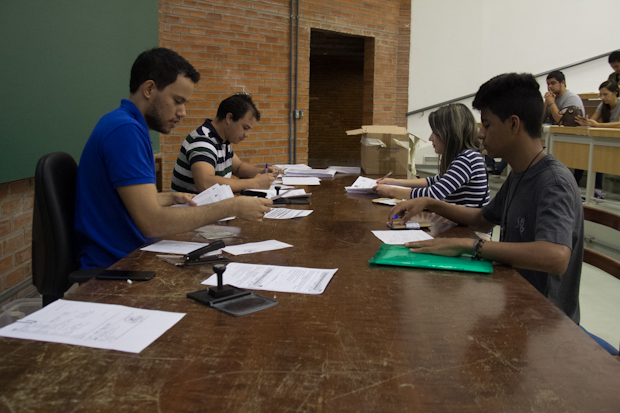 Registro acadêmico dos calouros de 2017. Esta etapa decorre da aprovação em uma das formas de seleção da instituição. Antes da digitalização do processo, os futuros alunos entregavam seus documentos e, após conferência, recebiam a confirmação do seu ingresso e o número da matrícula. Durante os dias disponibilizados para o registro, alunos voluntários ajudavam a recepcionar os calouros com informações, disponibilização de plaquinhas com o nome do curso para fotografias, entre outras ações. Se desejado, também era possível dar início à confecção da carteirinha de estudante junto à empresa responsável. Desde 2020, o registro acadêmico é realizado de forma on-line.