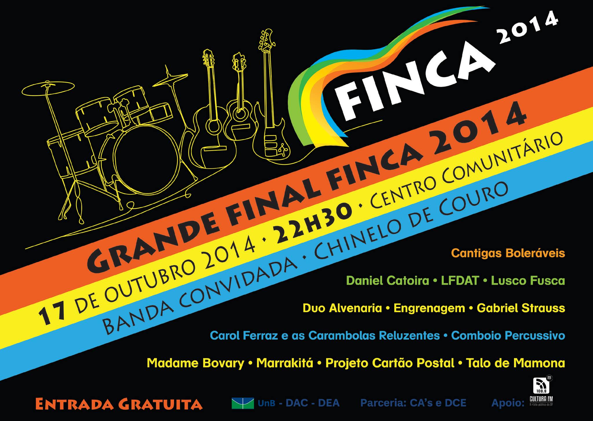 Festival Universitário de Música Candanga da UnBPatrícia Arantes8 de janeiro de 2026 Documento 13 (1) Baixar MetadadosTítuloFestival Universitário de Música Candanga da UnBDescriçãoCartaz anuncia a Final da edição FINCA de 2014.AutorAcervo FINCAUnidade responsável na UnBDecanato de Assuntos ComunitáriosData(s)2014Tipo de MídiaJPGDireitosDireitos reservados ao DEAC/DAC/Coordenação de Arte e CulturaNome da exposiçãoNome da exposição - UnB 60 anos - protagonismo estudantil - FINCA