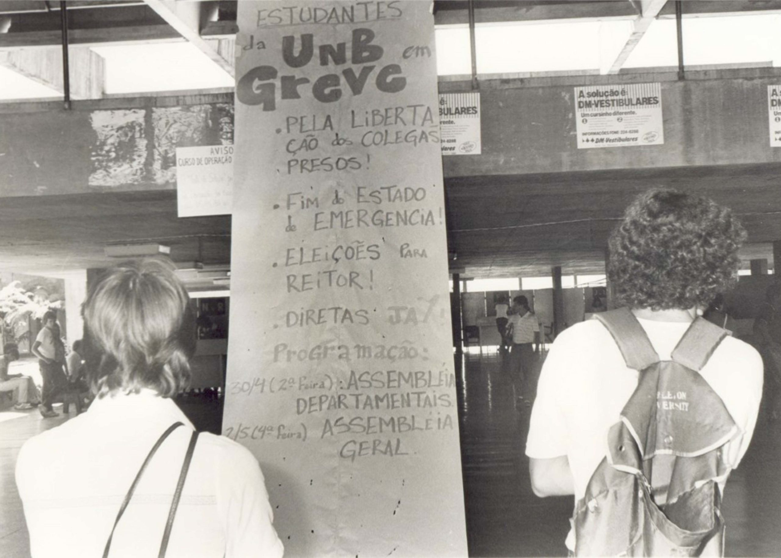Diretório Central de Estudantes (DCE) da UnBPatrícia Arantes8 de janeiro de 2026 Documento Diretório Central de Estudantes (DCE) da UnB 15 Baixar MetadadosTítuloDiretório Central de Estudantes (DCE) da UnBDescriçãoMovimento estudantil durante as Diretas Já: Estudantes observam cartaz com anúncio da greve dos estudantesAutorArquivo Central UnBUnidade responsável na UnBDecanato de Assuntos ComunitáriosLinks relacionados:https://atom.unb.br/index.php/00391-02Data(s)1984Tipo de MídiaJPGDireitosUniversidade de Brasília. Arquivo Central. AtoM UnB. https://atom.unb.br/index.php/00391-02Nome da exposiçãoNome da exposição - UnB 60 anos - protagonismo estudantil - DCE