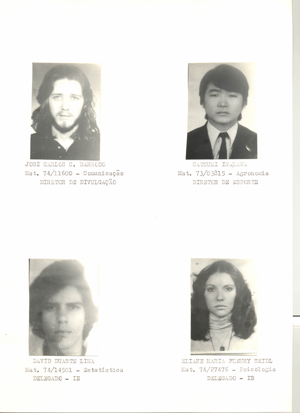 Membros da primeira diretoria do Diretório Universitário da Universidade de Brasília. A eleição, realizada em 20 de novembro de 1976, consagrou como vencedora a chapa Unidade, com 50,2% dos votos. Na imagem, as fotografias de: José Carlos C. Barroso (diretor de divulgação), Catsumi Iwakawa (diretor de esporte), David Duarte Lima (delegado) e Eliane Maria Fleury Seidl (delegada).